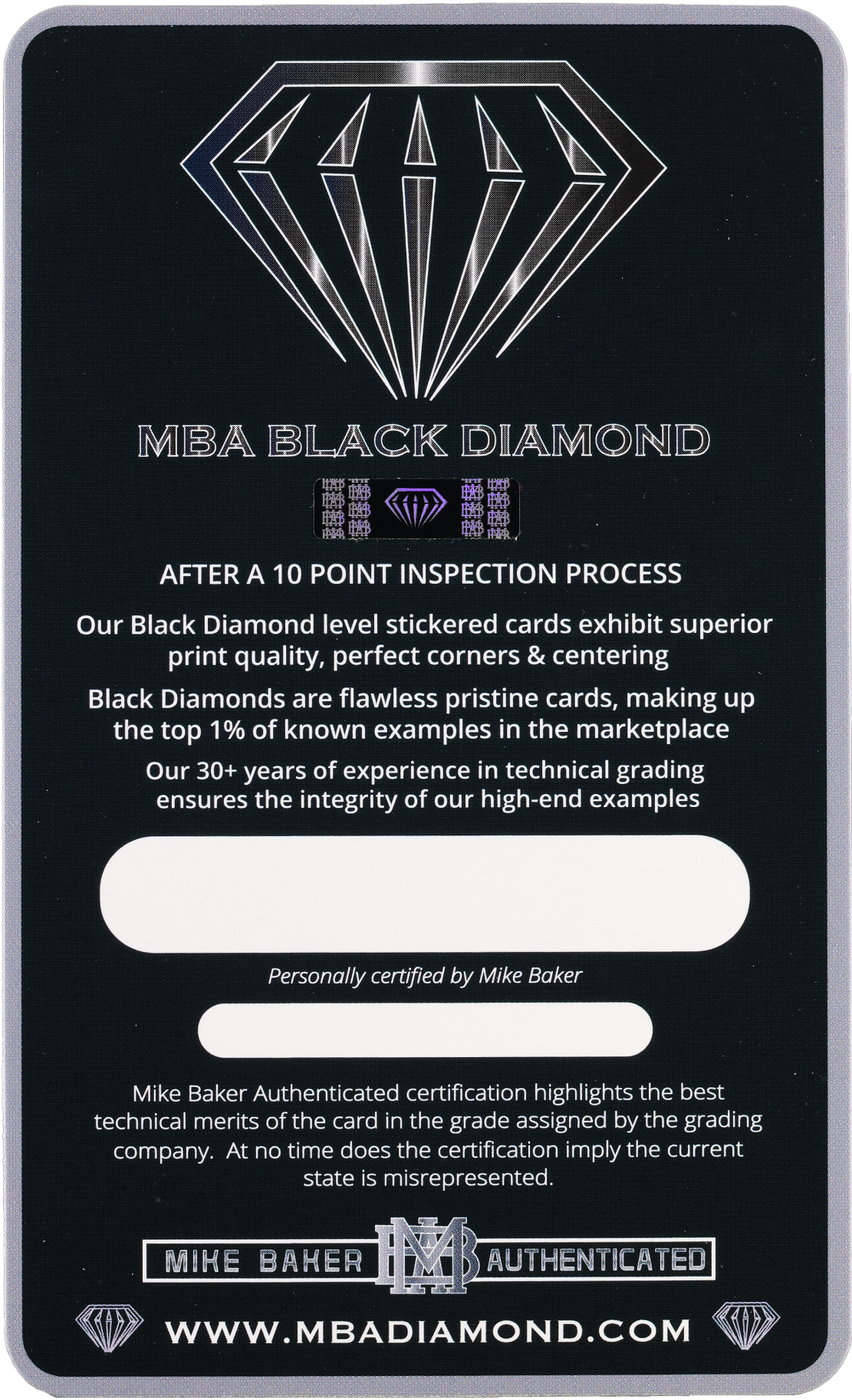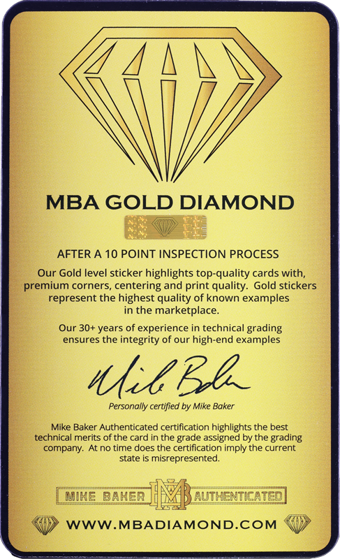 MBA's Diamond Digital Review service provides customers with the feedback they need to make smarter purchases and create more efficient Diamond Certification submissions. Only the top ~15% of quality, within the assigned grade, statistically receives an MBA Diamond Certification. Like real diamonds, MBA Diamond Certified trading card are rare and mining for diamonds can be tedious. Use Diamond Digital Review before you buy at a trade show or auction, or vet your collection prior to a Diamond Certification submission. Simply link a card URL or upload a high-resolution image and put Mike Baker at your side.